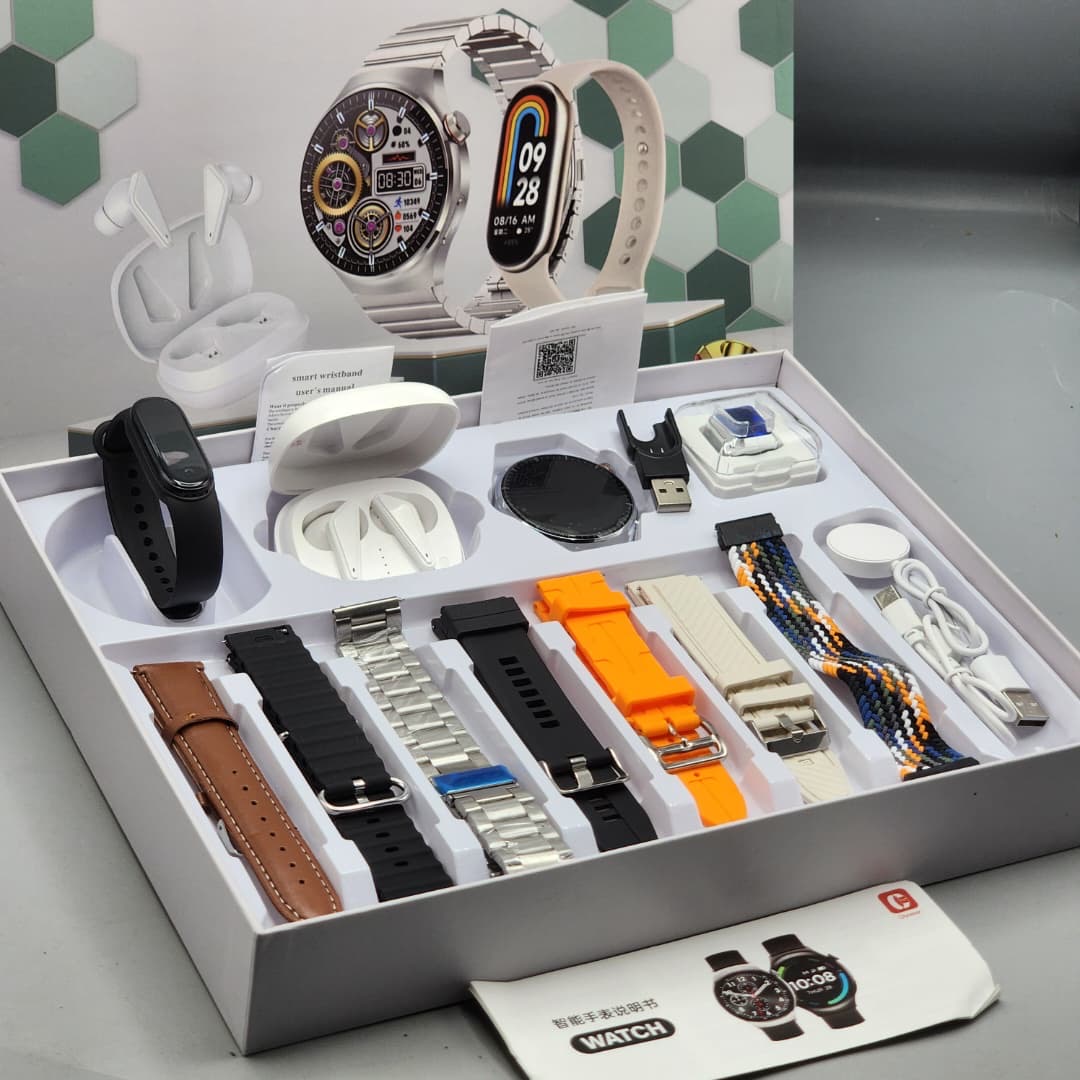 Comes with 7 straps -Smartwatch -Health check ring -Health watch - Airpod Available for- Android devices Available for iPhone devices FUTURES: • Making & Answer Calls via Bluetooth v5.2 • WhatsApp • Facebook • twitter • music • 2.02 inch Touch Screen, Smart split screen • Rugged Design - Quick Action button Customizable • About 3 Days Battery Life, Wireless Charging • Power Saving Mode • Heart Rate & Blood Pressure Monitor • Wallet Function & Business Cards • Multifunction NFC, Voice Assistant • Location Sharing, Tiktok Remote Control • Multi-Sport Modes • IP67 Waterproof